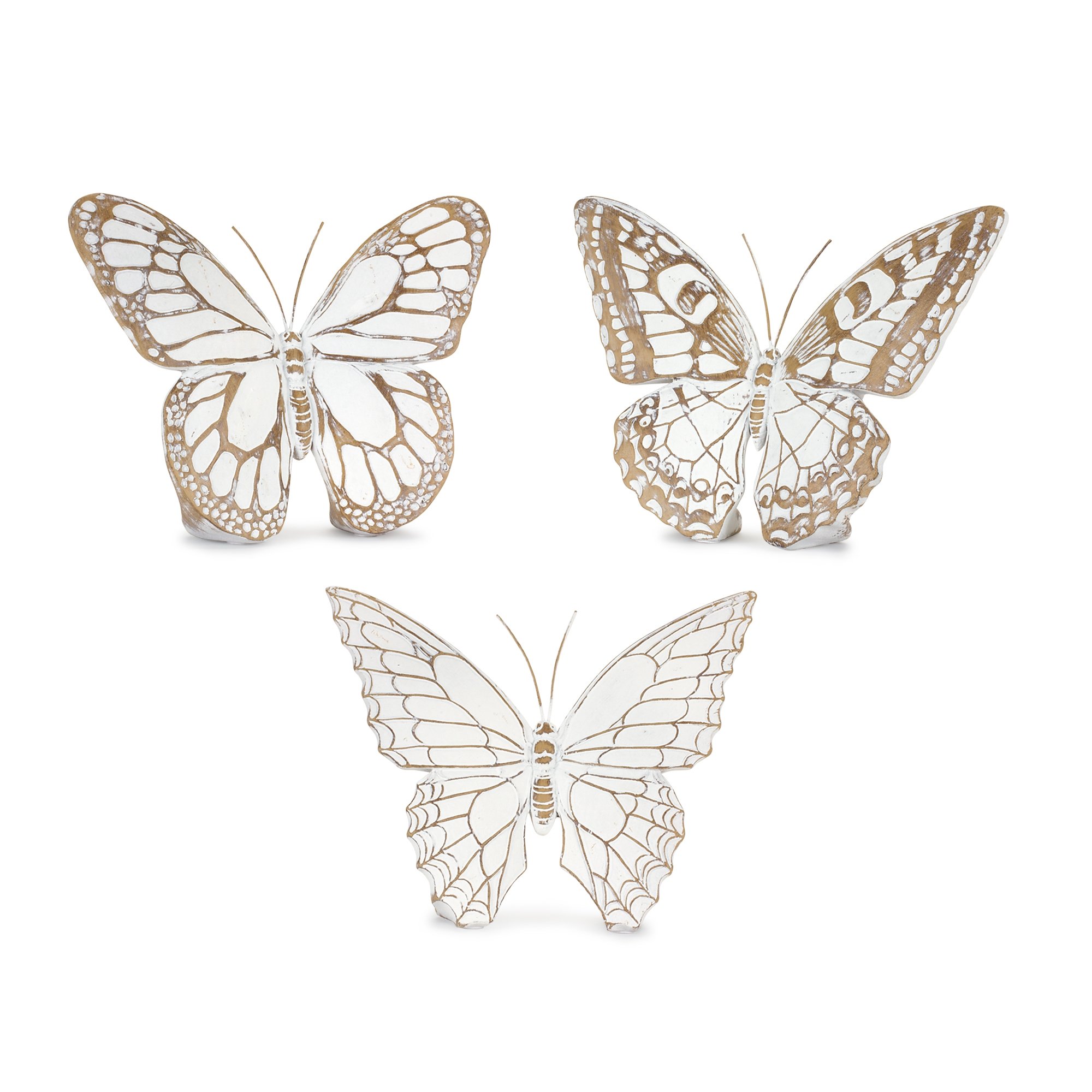 The beautiful set of white-washed butterfly figurines is the perfect addition to your Spring decor. Featuring three assorted designs, this set is sure to add a touch of nature to your living space. The bright white and faux wood finish paired with the metal antennae accents is the perfect combination to create a stunning display. Place the pieces together to make a statement, or display them throughout your home to add interest to the rooms.