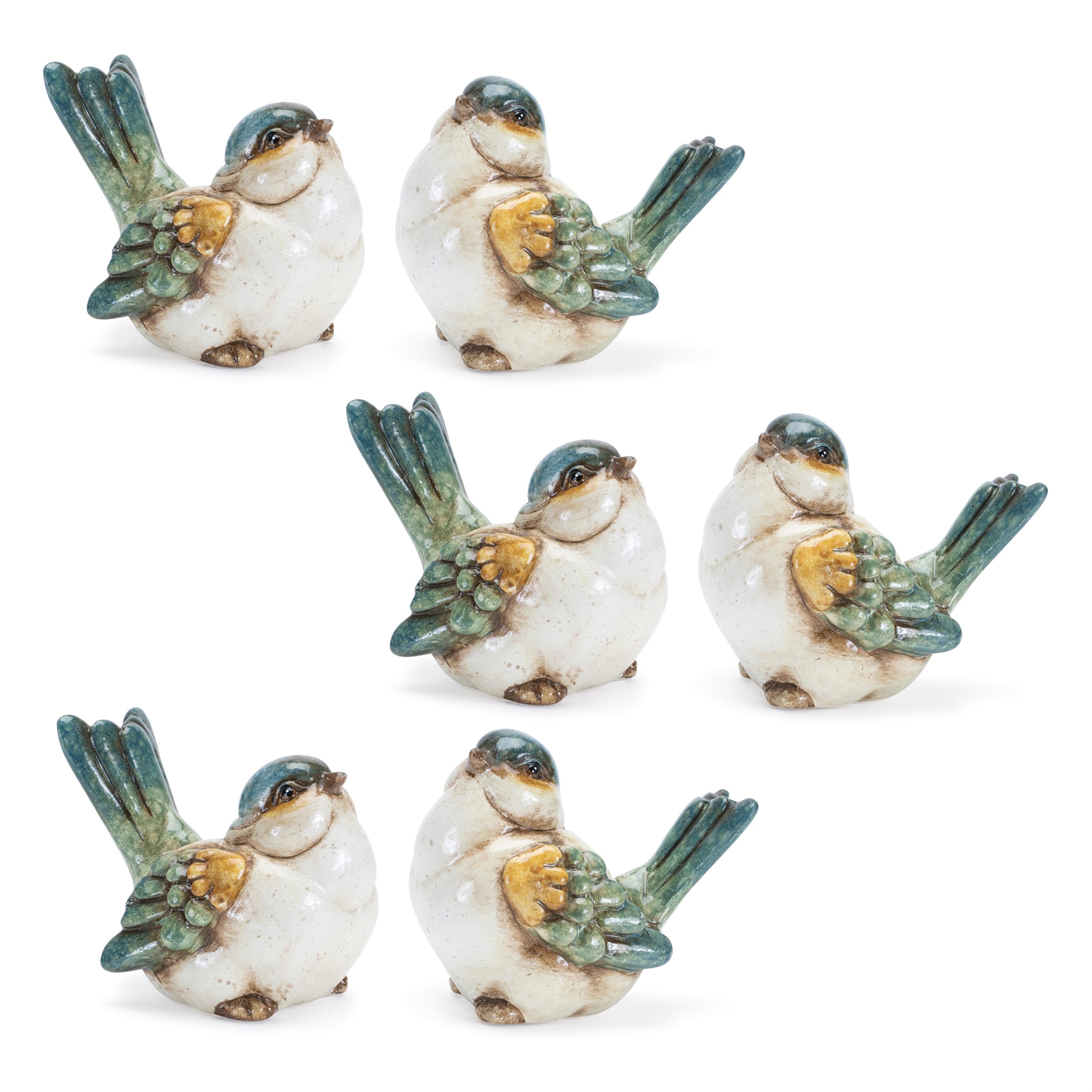 Bring serenity into your home this Spring season with a stunning set of bird figurines. Featuring six pieces with three assorted designs, this set is a great fit for your country cottage style of decor. The distressed beige, yellow and blue tones paired with the glazed finish are perfect to create a memorable display. The quality terra cotta composition is sure to endure for seasons to come. Display the pieces on your bookshelf or coffee table to add sophistication, or gift them to a bird-lover in your life to share the beauty!